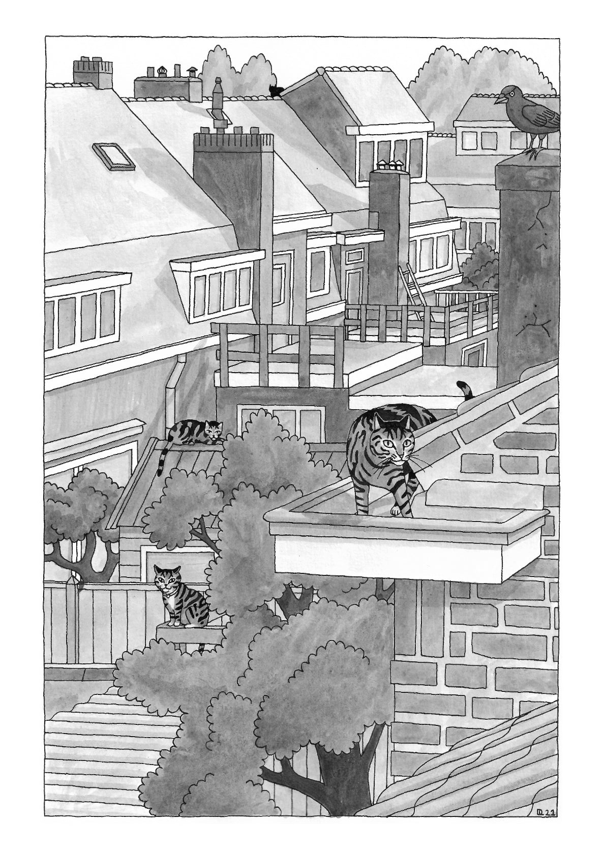 "Backyard cats" by Dimitri Lak The cats that roam the backyards of Assendorp in Zwolle (the Netherlands). The original is a handmade drawing, made with indian ink and ink wash technique.