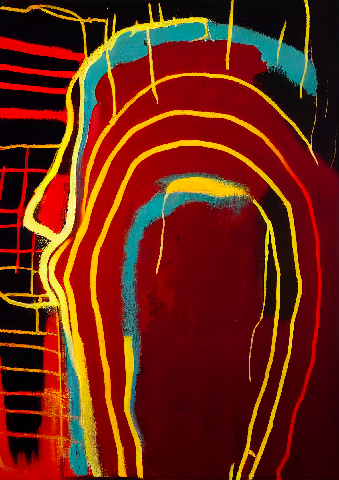 Abstract digital painting with bold yellow & red lines & turquoise elements that create a dynamic composition.