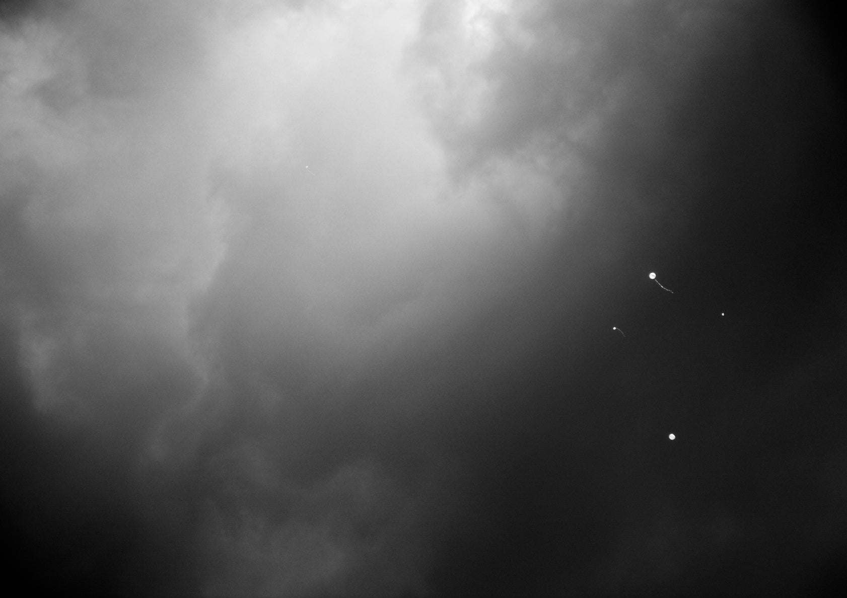 Four balloons drift into the atmosphere, creating a sense of displacement. To whom did the balloons belong to, and was the act of releasing them deliberate?
