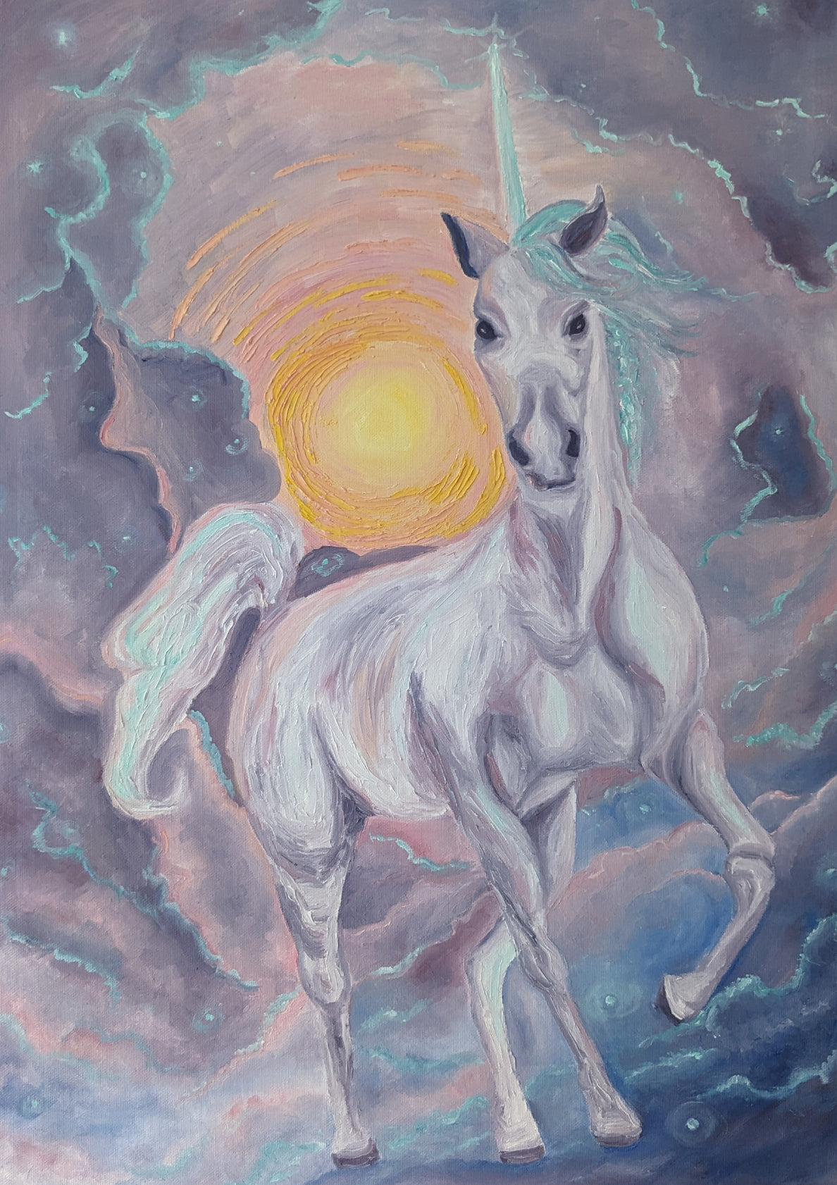 This piece comes from the fascination with unicorns, magic, and the unknown. Seen in your dreams unicorns represent growth of the feminine energy, enchantment and miracles.