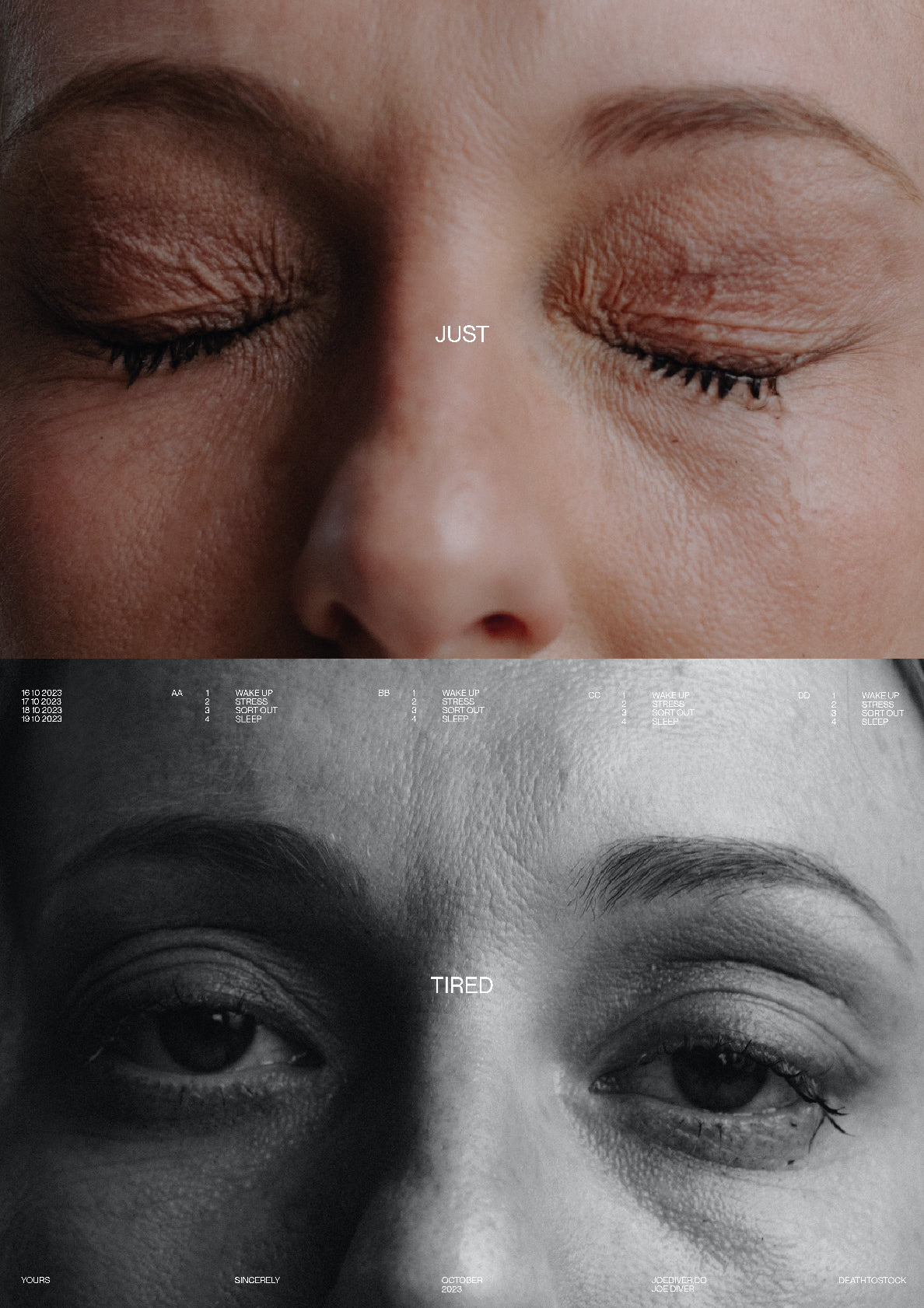 "Just Tired" captures the dual essence of exhaustion and resilience through contrasting images, a poignant reflection on life's weariness and inner strength.