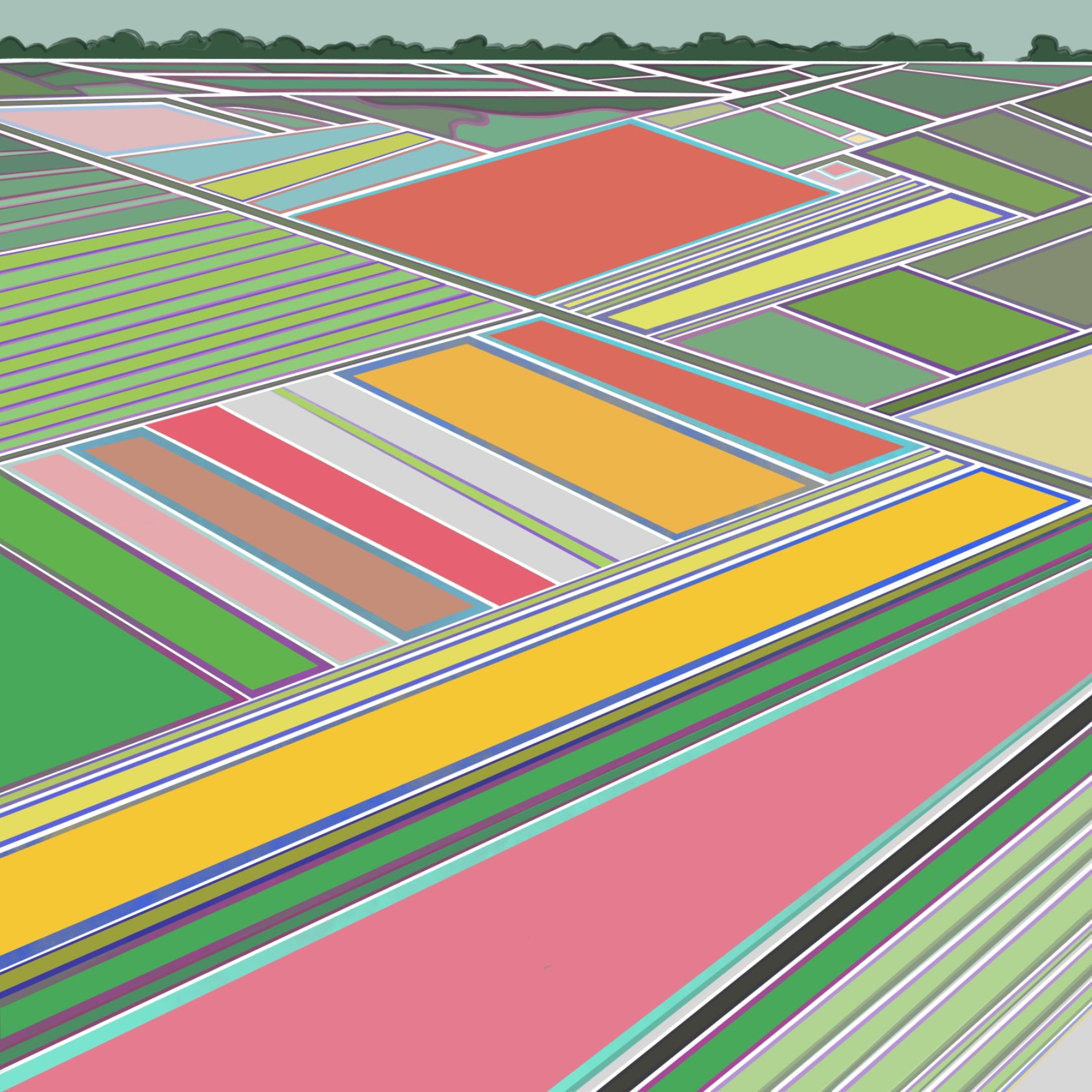 In English, “lappendekken” translates to “patchwork” or “quilts”, which is how I experience the fields of tulips in the Netherlands. The “lite” version of these prints features a white ground.