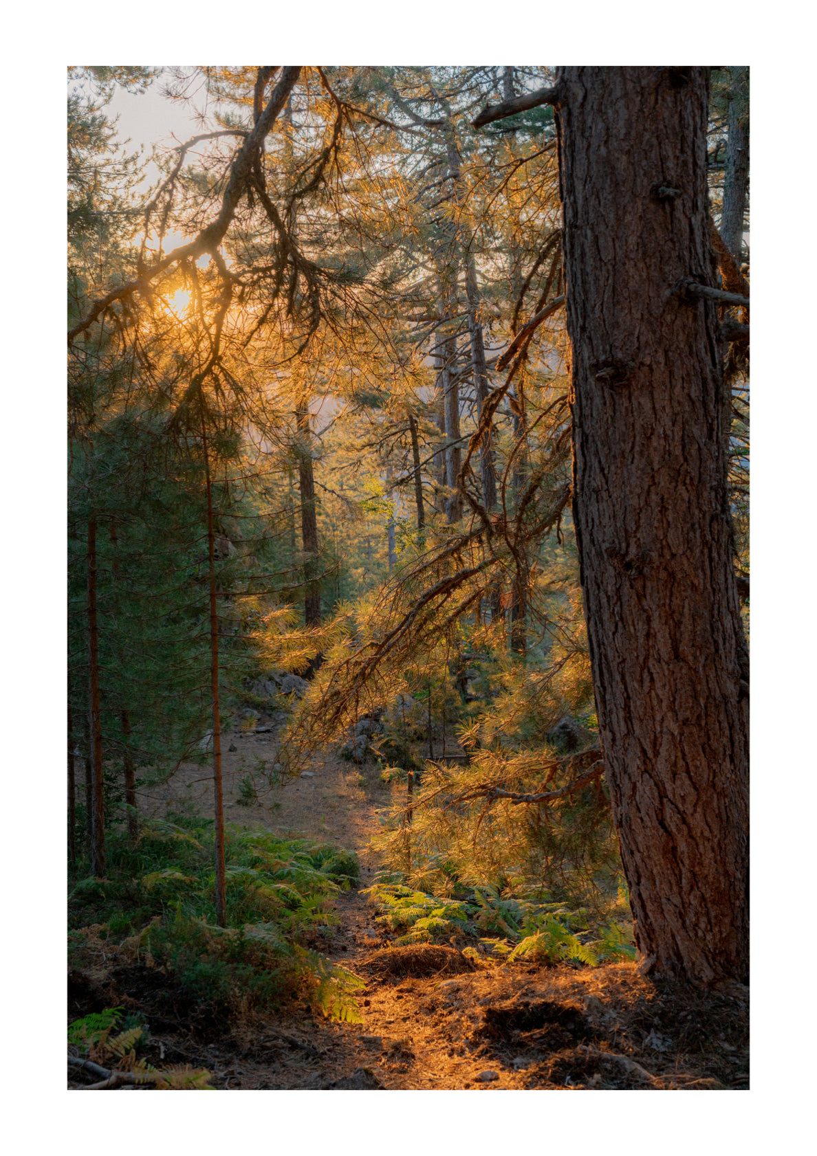 The sunrise breaking through a forest of Laricio Pines endemic to Corsica. Photographed whilst hiking the GR20 – a long distance mountain trail traversing the island of Corsica.