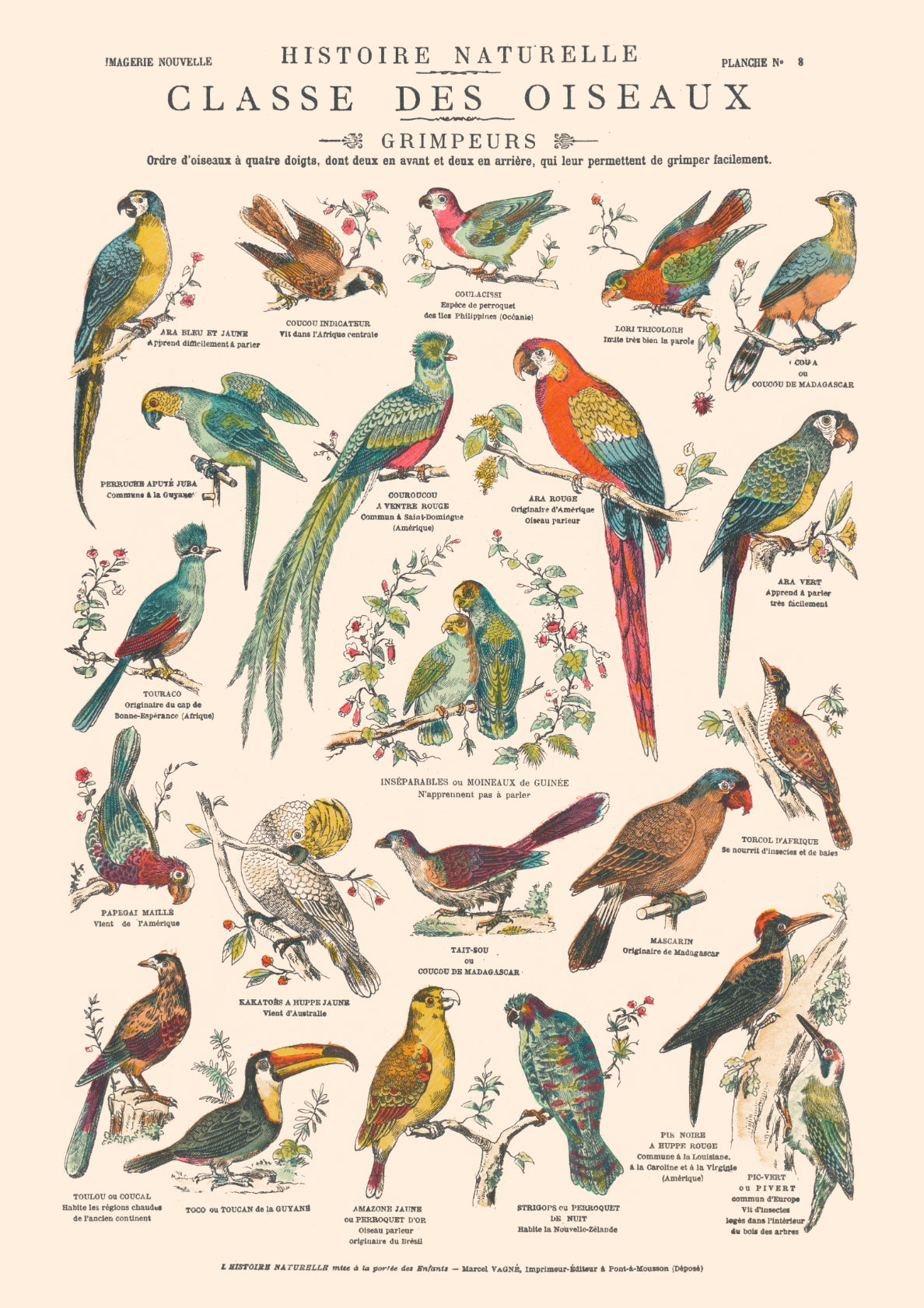 Les Grimpeurs, Classe des Oiseaux. Vintage birds chart from 1850, remastered by Aster.