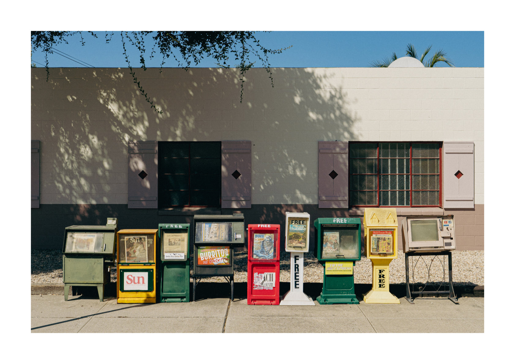 Newspaper boxes in the centre of the small town – part of a new body of work created travelling from San Francisco to Los Angeles on Route 1 of the Pacific Coast Highway in September 2022.