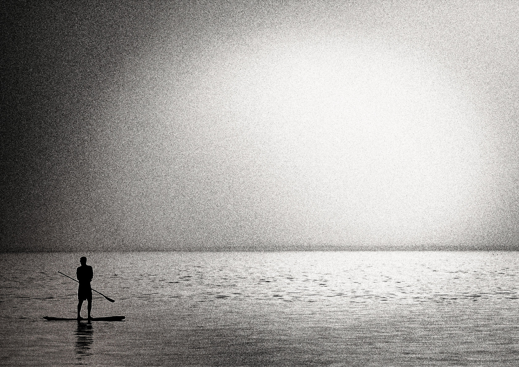 Mediterranean sunset and person on a stand up paddle, Tel Aviv, Israel.