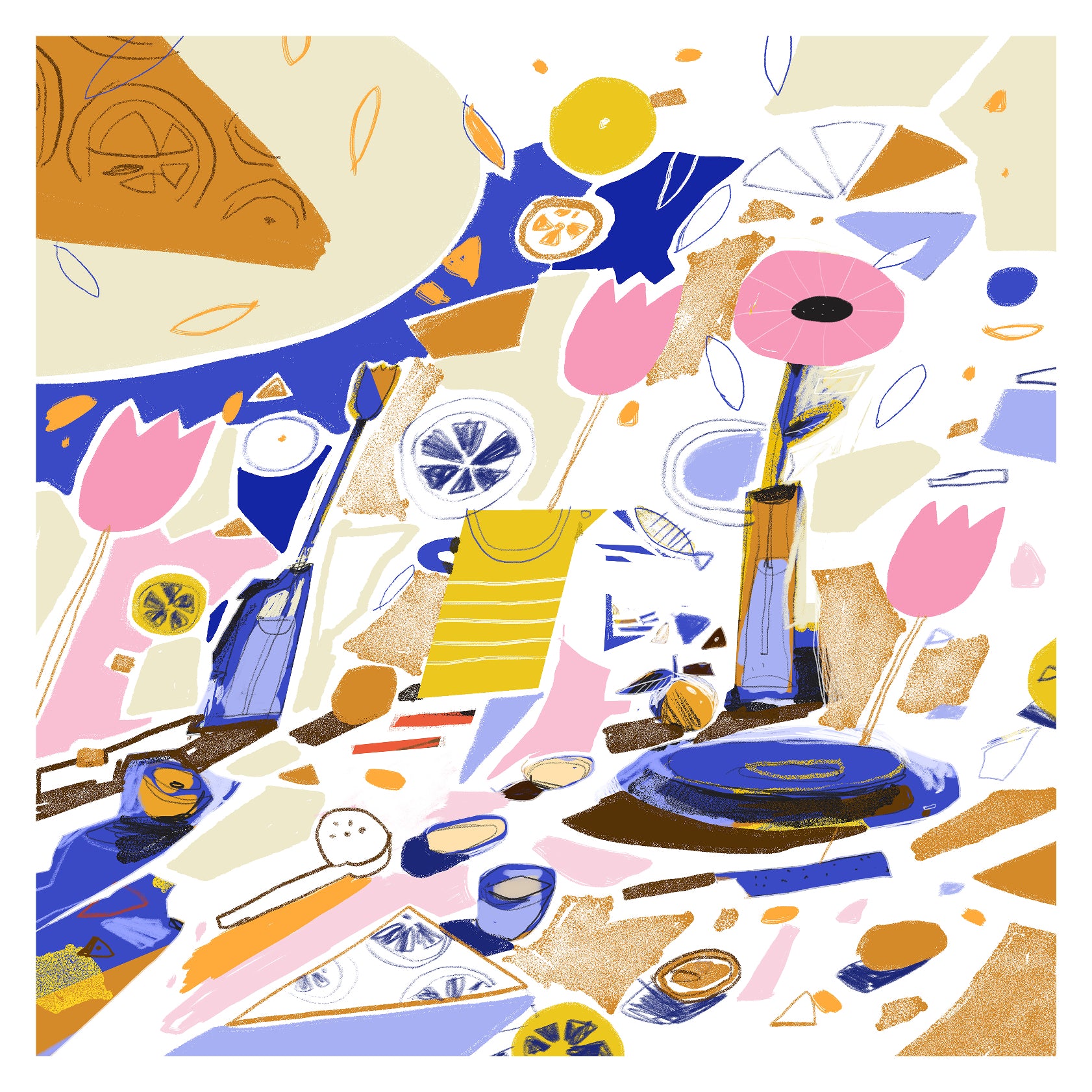 Pink, blues, vibrant yellows, and earthy browns coalesce into one. Colors breathe life into this abstract still life, creating a mirage of stillness and vibrancy.