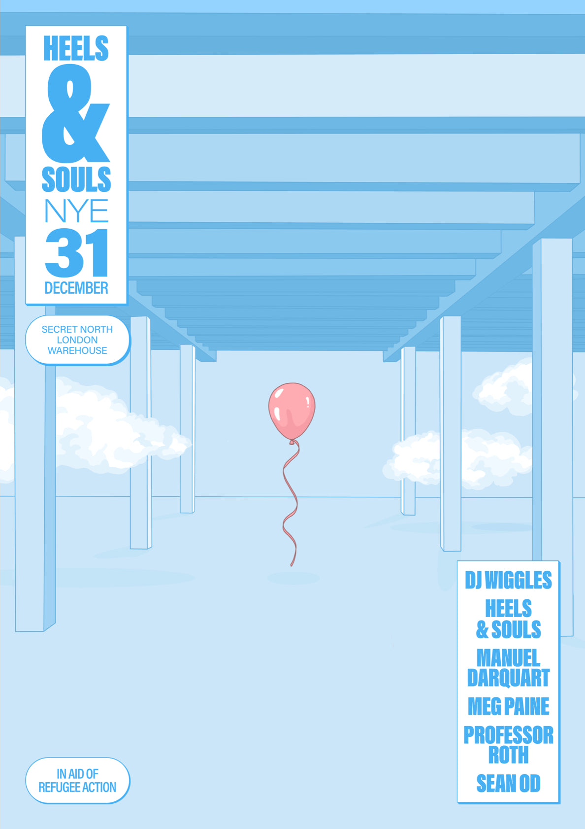 Illustrated and Designed by Really Really Studio for Heels and Souls NYE Warehouse Party ft DJ Wiggles, Manuel Darquart, Meg Paine, Professor Roth, Sean OD. 10% of profit goes to Refugee action.