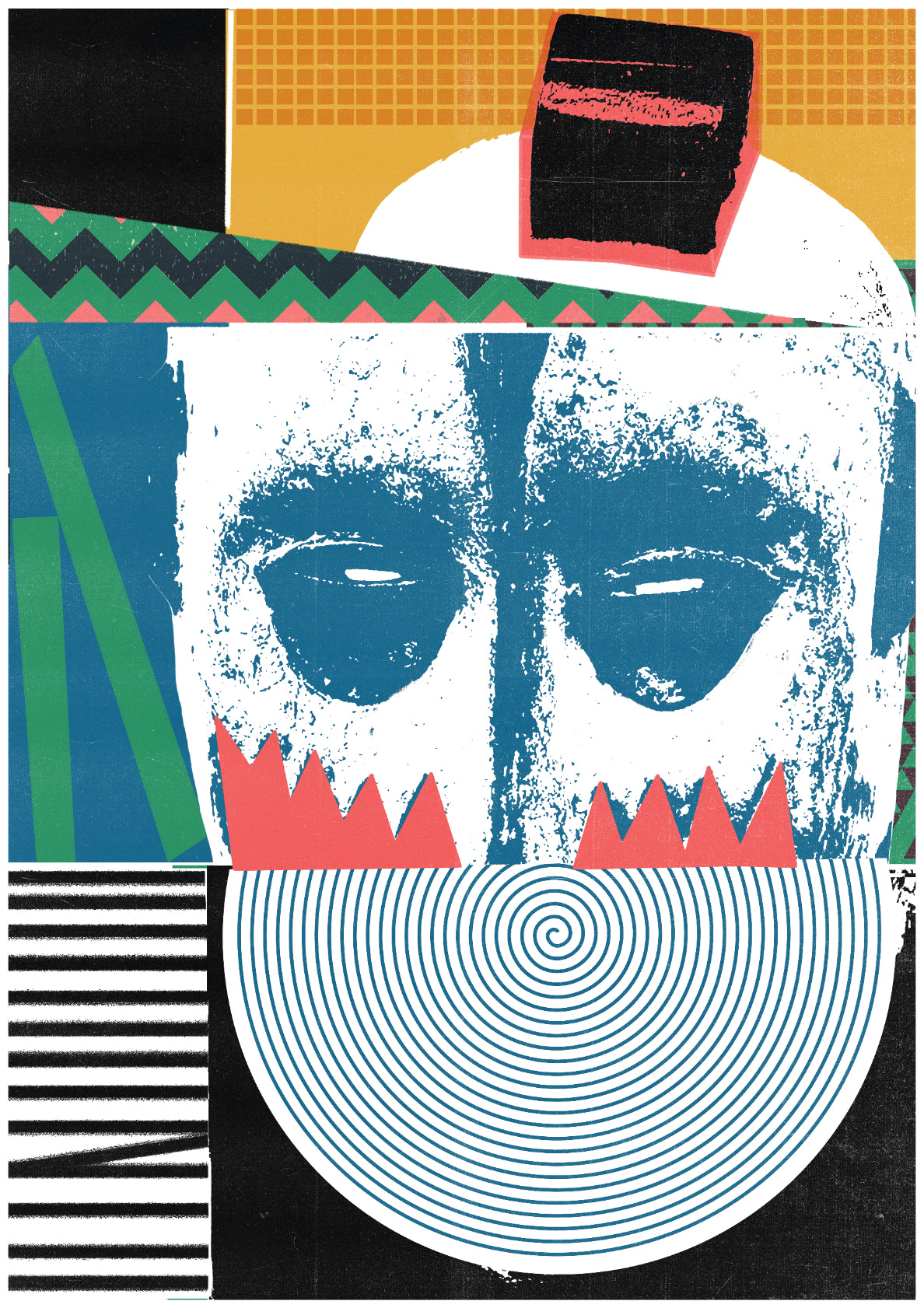 Inspired by Igbo mask from Nigeria, this composition aims to emphasize the hypnotic look of the African artifact by reorganising the deconstructed pieces.