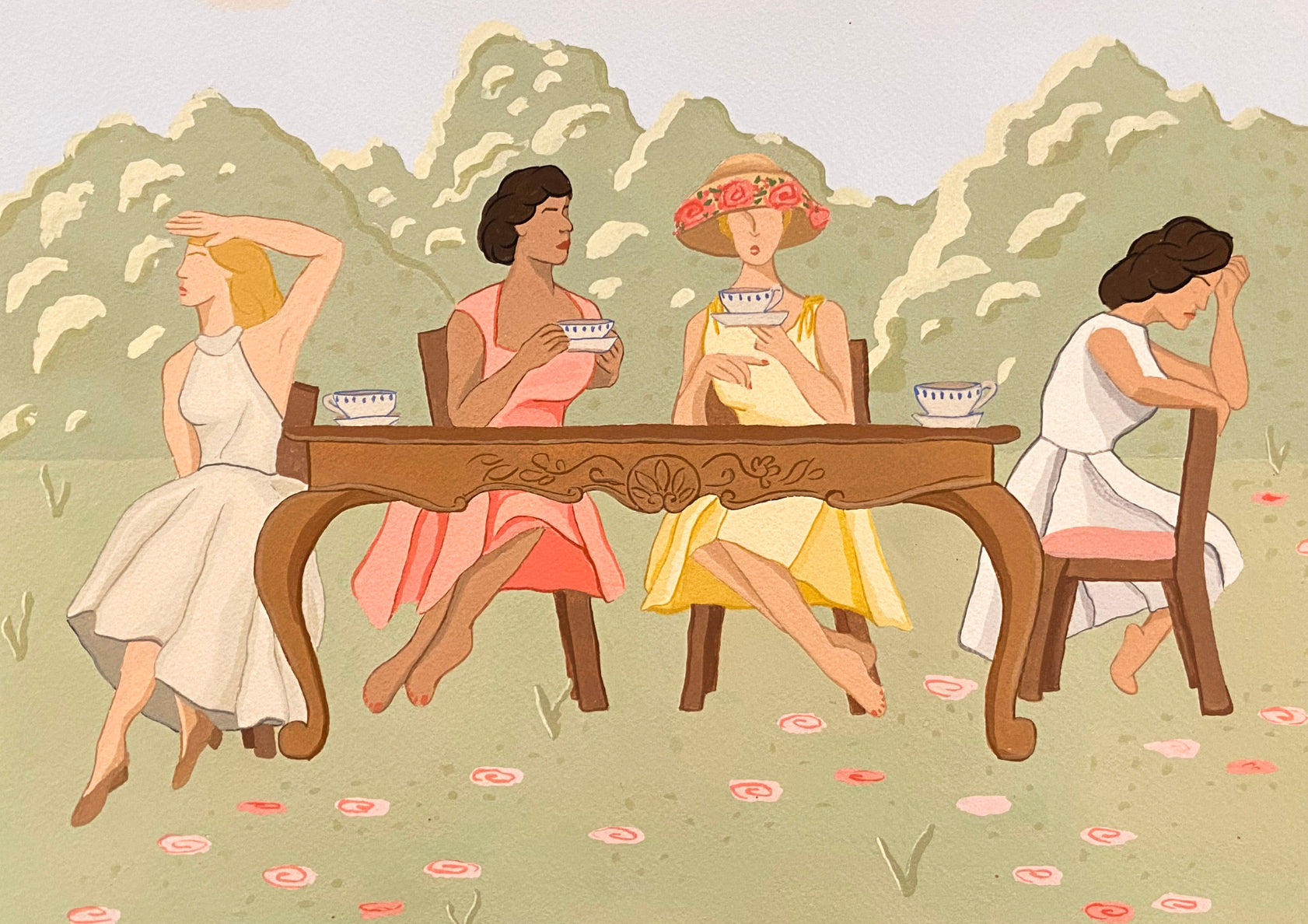 Gouache illustration, depicting a group of woman at a tea party getting in an argument.