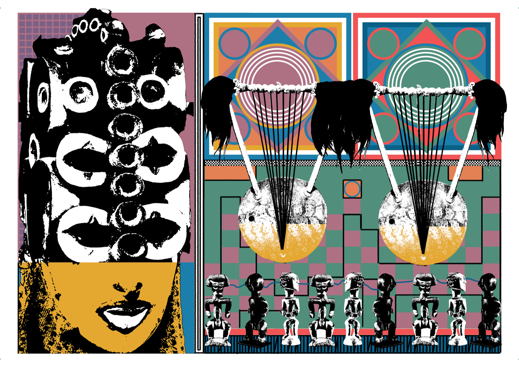 What’s in the composer’s mind when creating lyrics and rhythm for the various rituals? The mask on the left side is from the Igbo tribe from Nigeria and the two musical instruments are bowl lyres