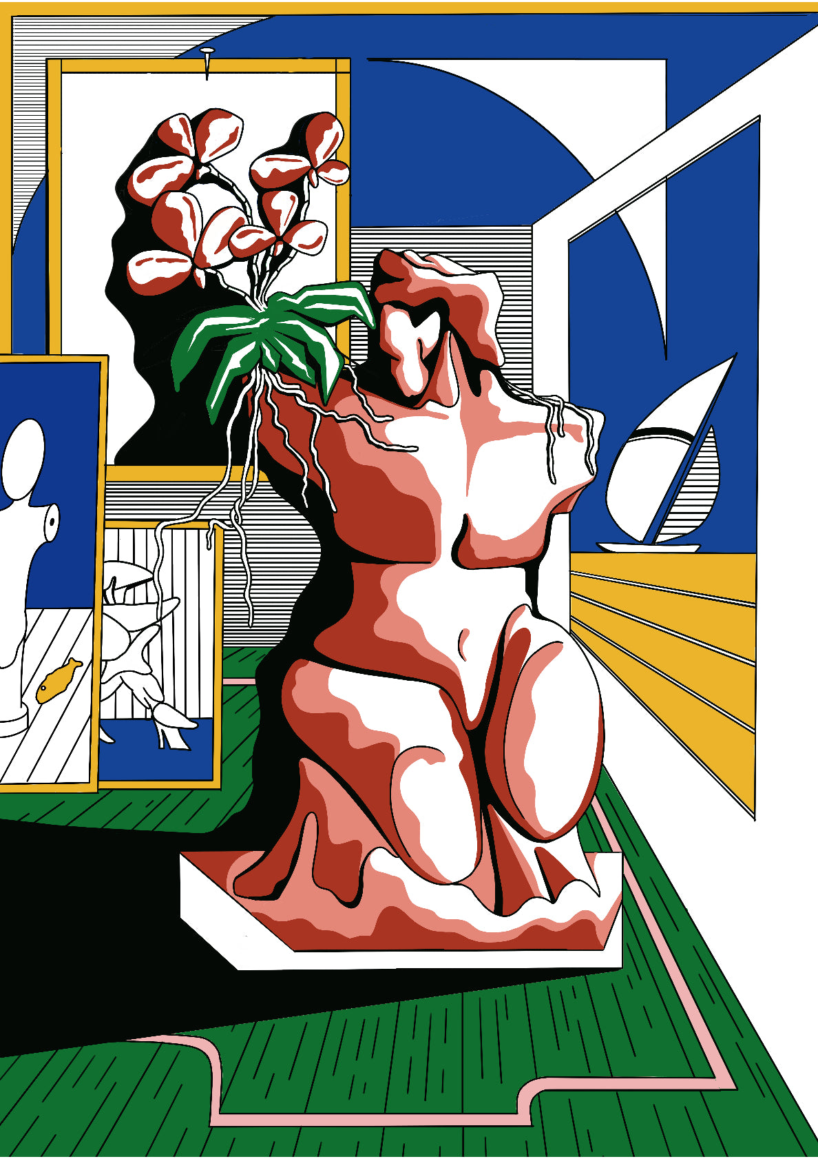 A room filled with light, adorned with paintings from the masters, and a wide view overlooking the ocean.