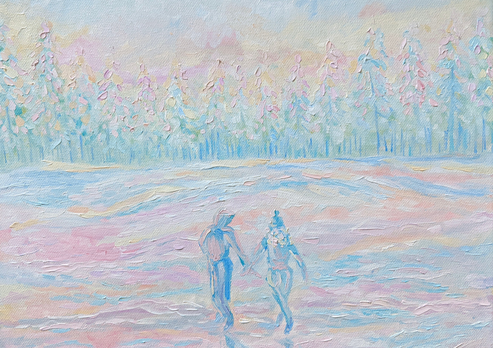 It's winter time. The sun is shining and the snow reflects its glow, immersing the forest in rainbow colours.