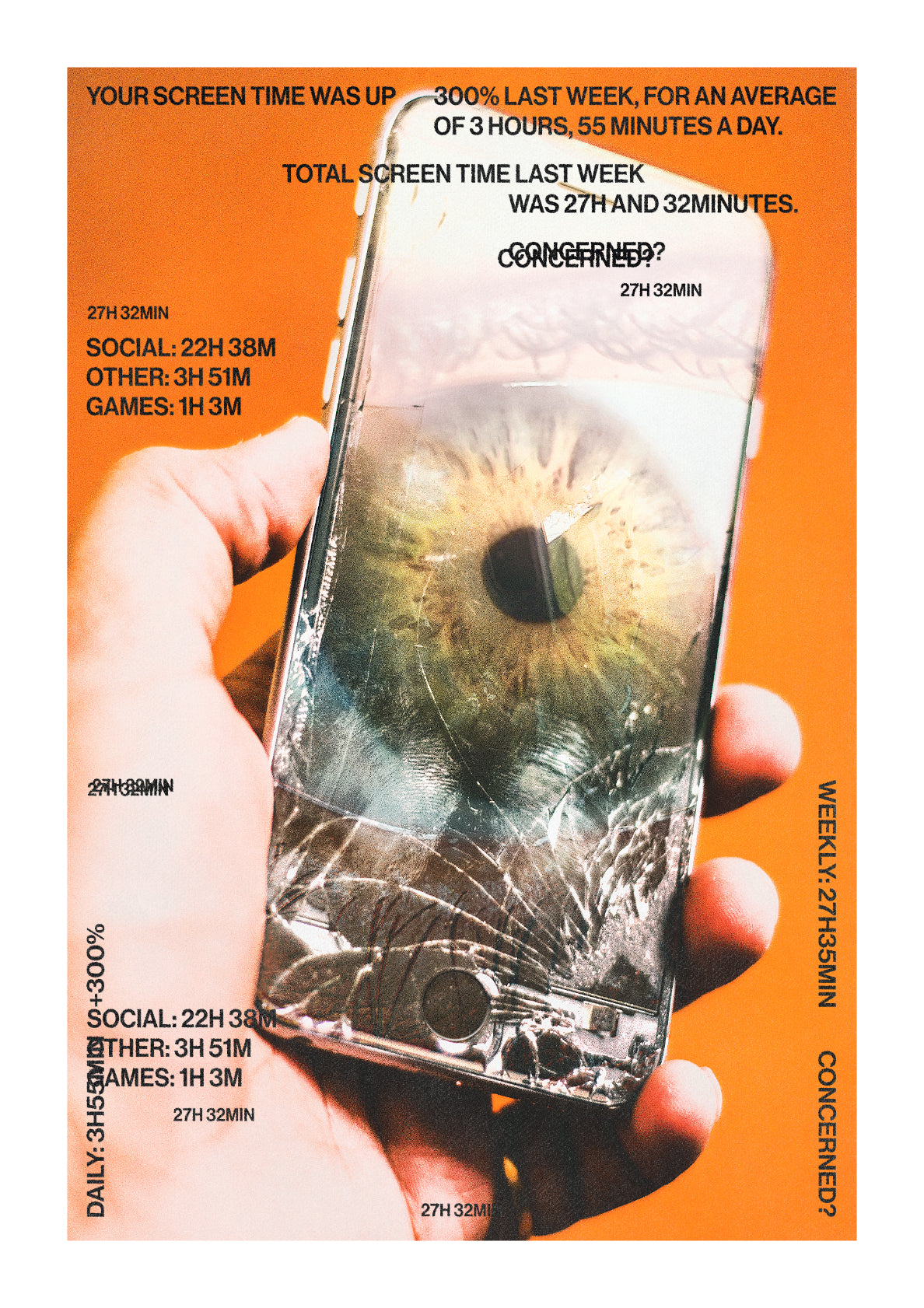 YOUR SCREEN TIME WAS UP 300% LAST WEEK, FOR AN AVERAGE OF 3 HOURS, 55 MINUTES A DAY. THATS 27H AND 32 MINUTES A WEEK. SOCIAL: 22H 38M OTHER: 3H 51M GAMES: 1H 3M